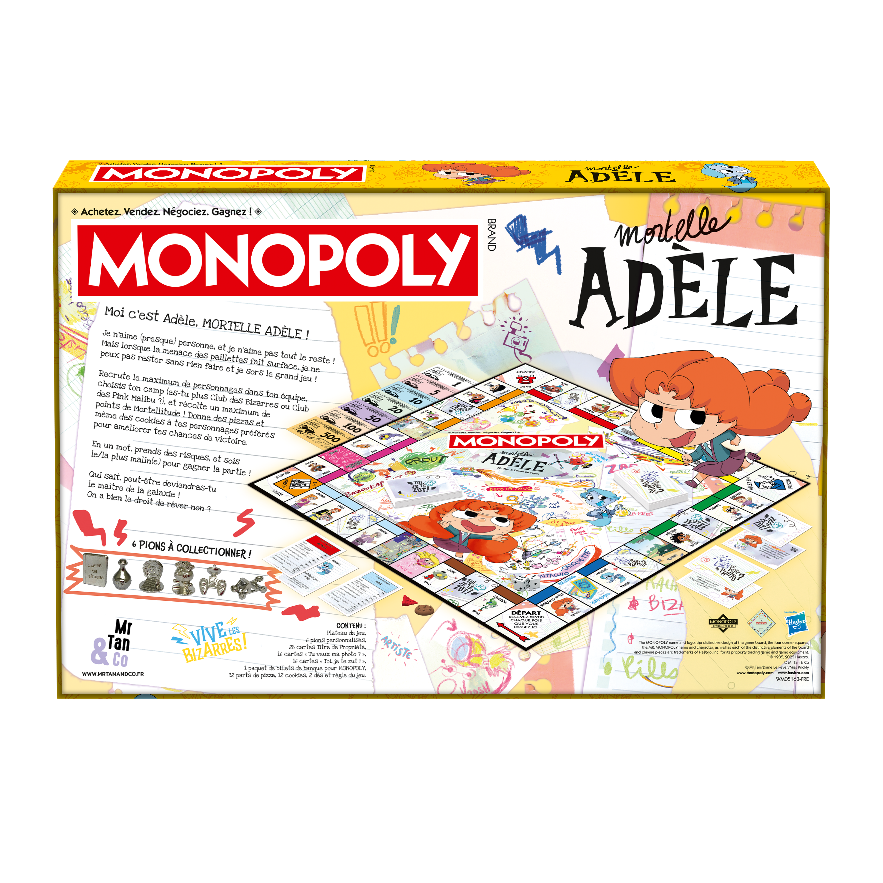 Dans cette édition spéciale du Monopoly Mortelle Adèle, choisis ton camp ! Seras-tu un membre intrépide des Pink Malibu ou rejoindras-tu les rangs déjantés du Club des Bizarres ? Recrute un maximum de personnages de ton équipe, accumule des points de Mortellitude, place des pizzas et des cookies sur tes personnages préférés et deviens le maître de la galaxie. Les cartes “Tu veux ma photo ?” et “Toi, je te zut !” remplacent les iconiques cartes “Chance” et “Caisse de communauté”.